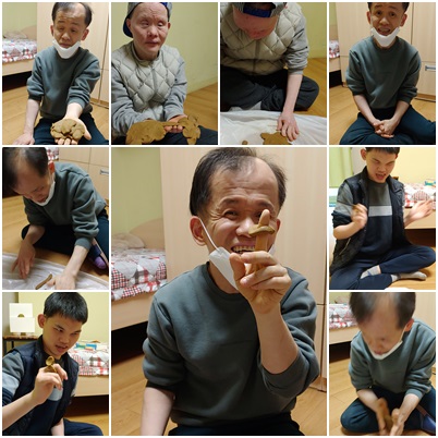 작은 찰흙 덩어리를 드리니 손안에서 굴리기도 하고 주물럭, 주물럭 만지기도 함.